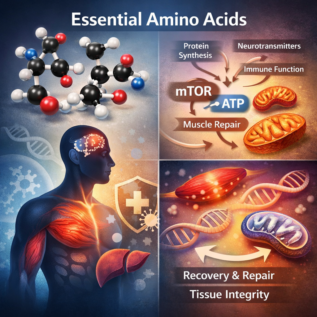 Glycine is a major constituent of collagen and connective tissue. This is not merely structural trivia. Tissue integrity influences circulation, mechanotransduction, and intercellular communication. When structure is compromised, signalling becomes distorted—often louder, more inflammatory, and less precise.