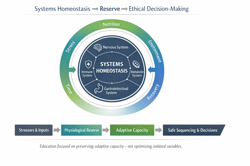 My educational programs are designed to train practitioners and professionals to think in terms of systems homeostasis, physiological reserve, and safe sequencing of interventions—rather than protocol stacking or short-term optimization.